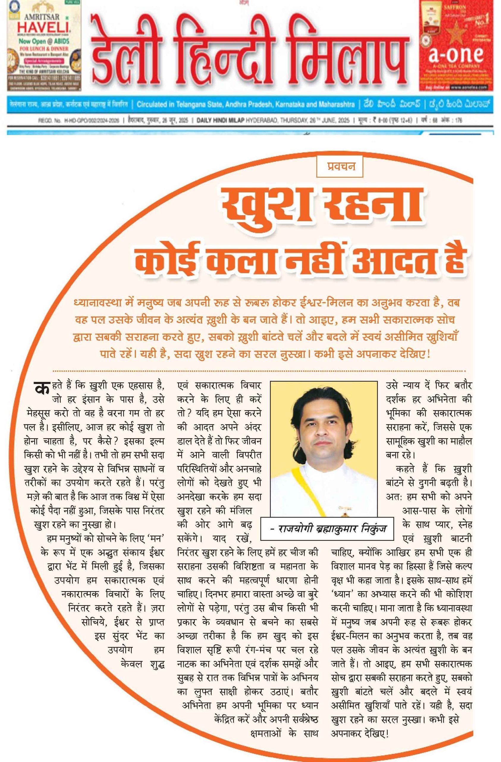 खुश रहना कोई कला नहीं आदत है -डेली हिन्दी मिलाप