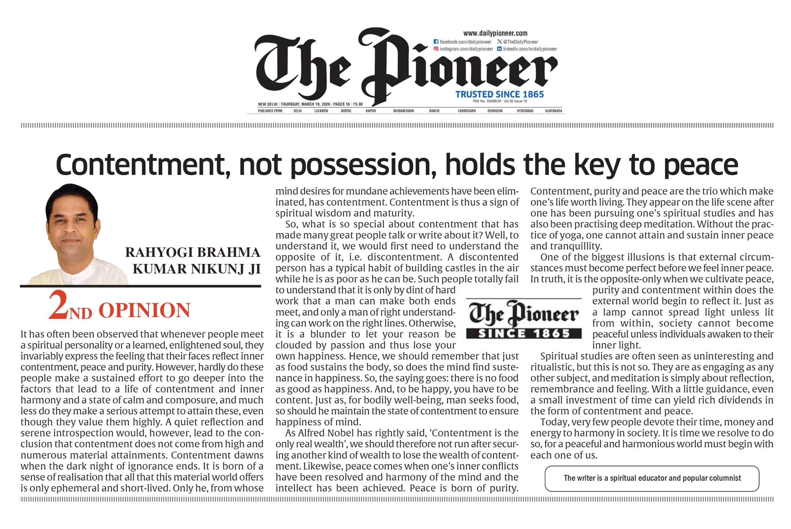 Contentment, not possession, holds the key to peace – The Pioneer – 19th March 2026