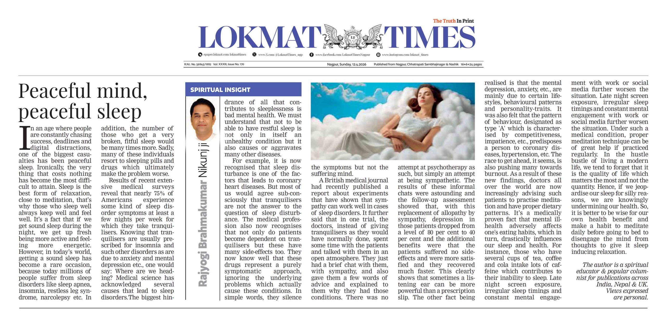 Peaceful mind, peaceful sleep -Lokmat Times